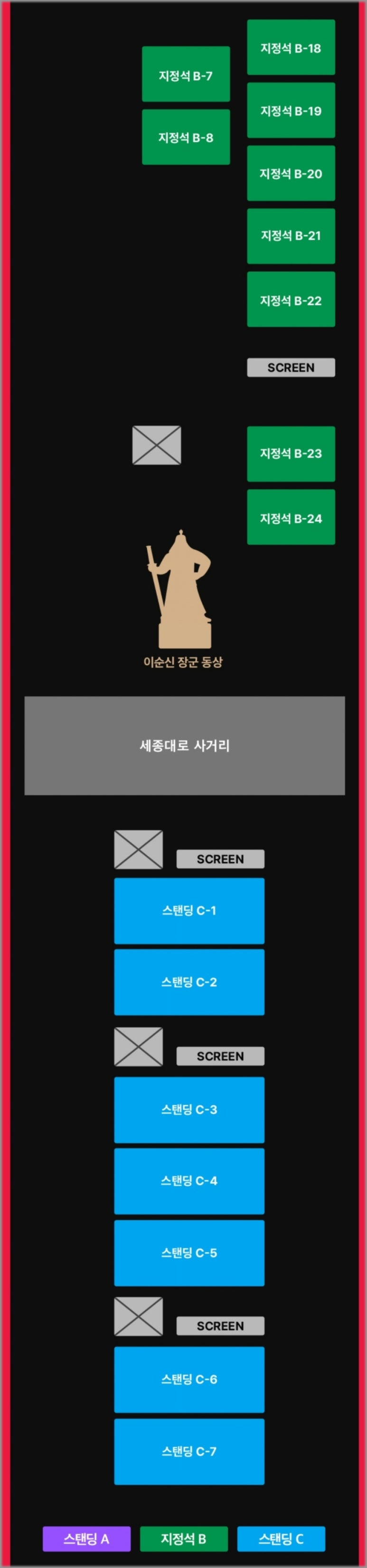 야외 공연인 만큼 광화문 광장의 넓은 공간을 어떻게 활용할지가 관건인데요. 세종대로 사거리를 중심으로 구역이 나뉘어 있어서 본인이 예매한 구역의 위치를 미리 파악하는 게 무엇보다 중요해요.